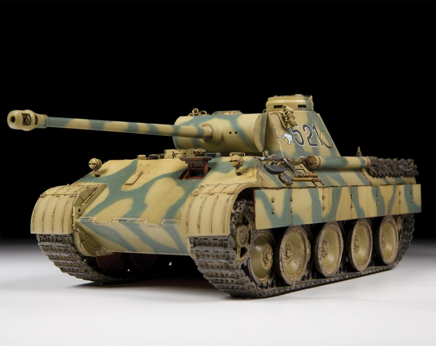 Историческая справка: Эта боевая машина была разработана немецкой фирмой MAN в 1941-42 годах в качестве основного танка вермахта. Боевым дебютом «Пантер» стала битва на Курской дуге. «Пантера» считается лучшим немецким танком Второй Мировой войны. Противостоять снарядам «Пантеры» могла лишь броня советских тяжёлых танков ИС-2.