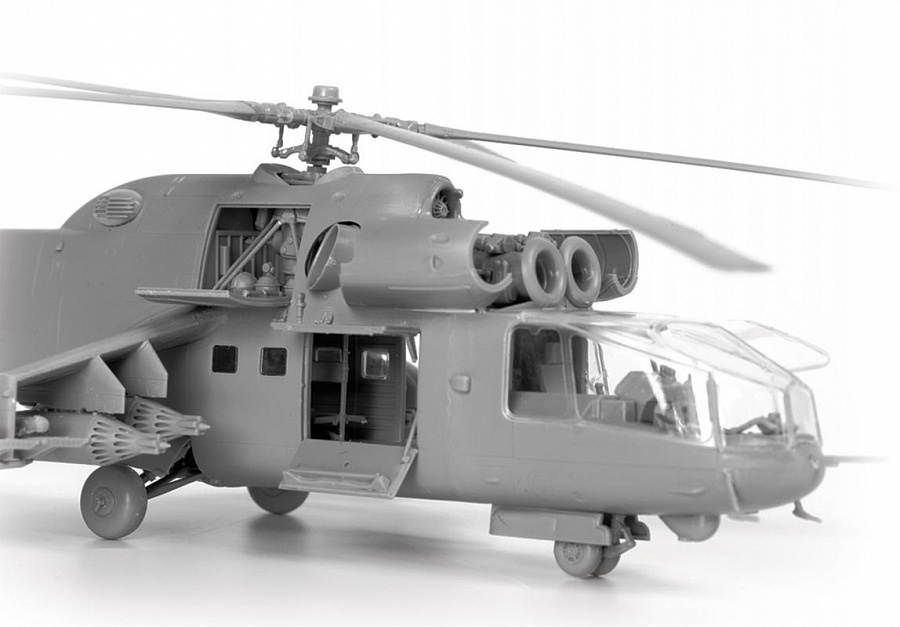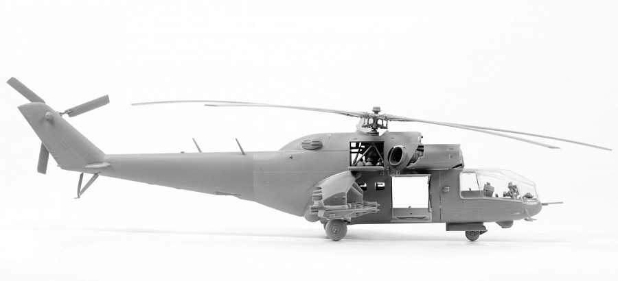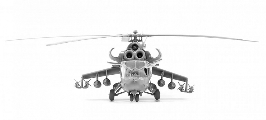 Историческая справка: Вертолет Ми-24А стал первой в мире «летающей БМП». Он не только перевозил 8 человек десантников, но и имел мощное бортовое оружие и надежную броневую защиту. Опытный экземпляр этого вертолета взлетел летом 1969 г., а уже в 1970-71 гг. Ми-24А начали поступать в войска. Пилот и оператор бортового комплекса вооружения защищались боковыми броневыми листами, лобовым пуленепробиваемым стеклом и бронированными сиденьями. Бронеплиты были установлены и на капотах двигателей. Вертолет получил двигатели и редуктор от хорошо зарекомендовавшего себя и надежного транспортного Ми-8. Вооружение на первой модификации состояло из пары ПТУР 9М17 противотанкового комплекса «Фаланга-М» с ручной системой наведения, подвижной установки НУВ-1 с крупнокалиберным пулеметом, блоков неуправляемых ракет или бомб.