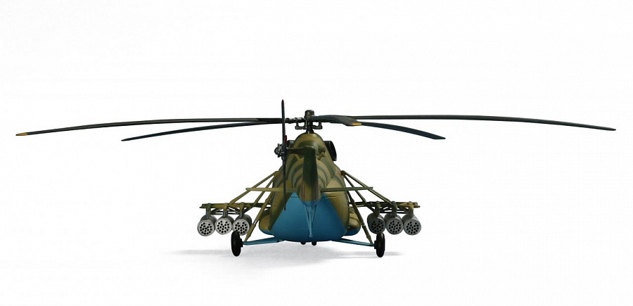 Высококачественные отливки, точно передающие характерные черты фюзеляжа, несущей системы (пятилопастный главный и трехлопастный рулевой винты), шасси и детали вооружения Ми-8МТ.