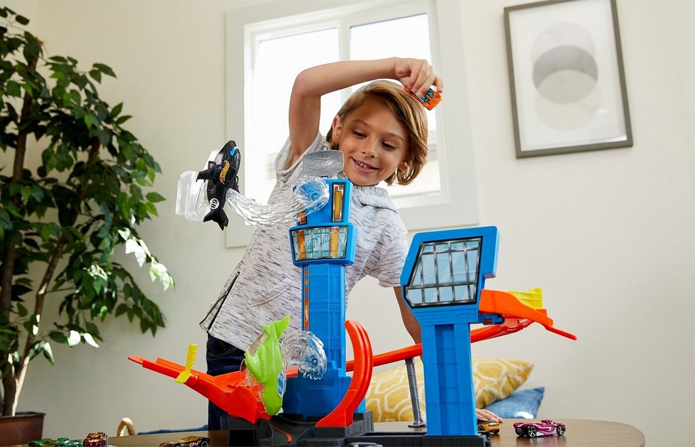 Автотрек HOT WHEELS City Аэропорт (GFH90) станет отличным подарком для юных гонщиков. Автотрек состоит из небольшого количества деталей, поэтому ребенок сможет сам собрать автотрек. Запустите машинку на оранжевую трассу и довезите до взлетной полосы, где ее уже будет ждать один из двух реактивных самолетов. Истребитель возьмет машинку с собой в полет в специальной корзине под ним и выбросит на вокзале, откуда машинка снова выедет на трассу. Либо же самолет может передать машинку второму самолету для головокружительного полета. Самолеты из набора летают по кругу в противоположных направлениях, что добавляет разнообразия игре. Все детали набора сделаны из качественного прочного пластика, а машинка – из литого металла. Игровой набор совместим с другими наборами от Hot Wheels. Высота набора: 45 см. Питание: 2 батарейки типа D (LR20) (не входят в комплект).