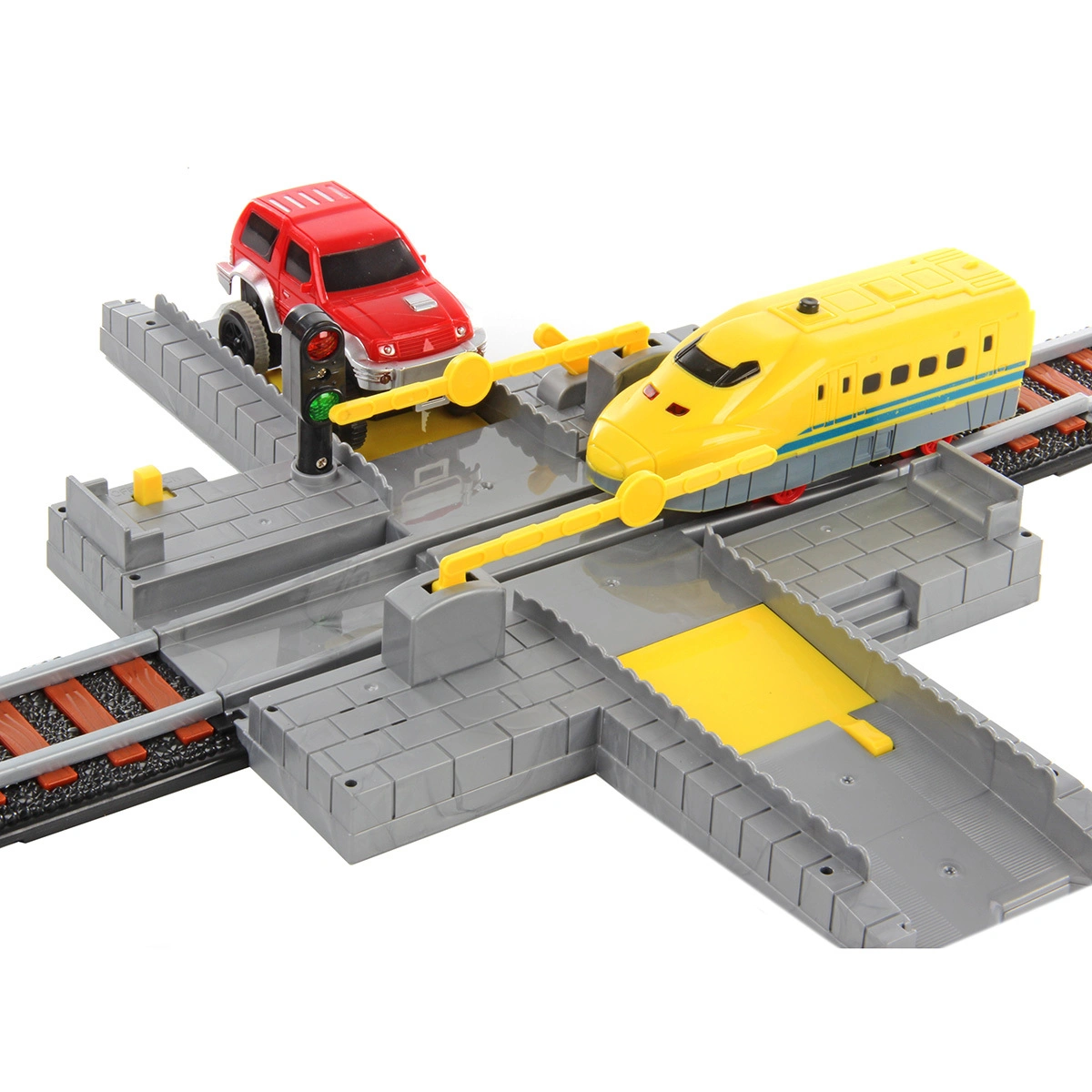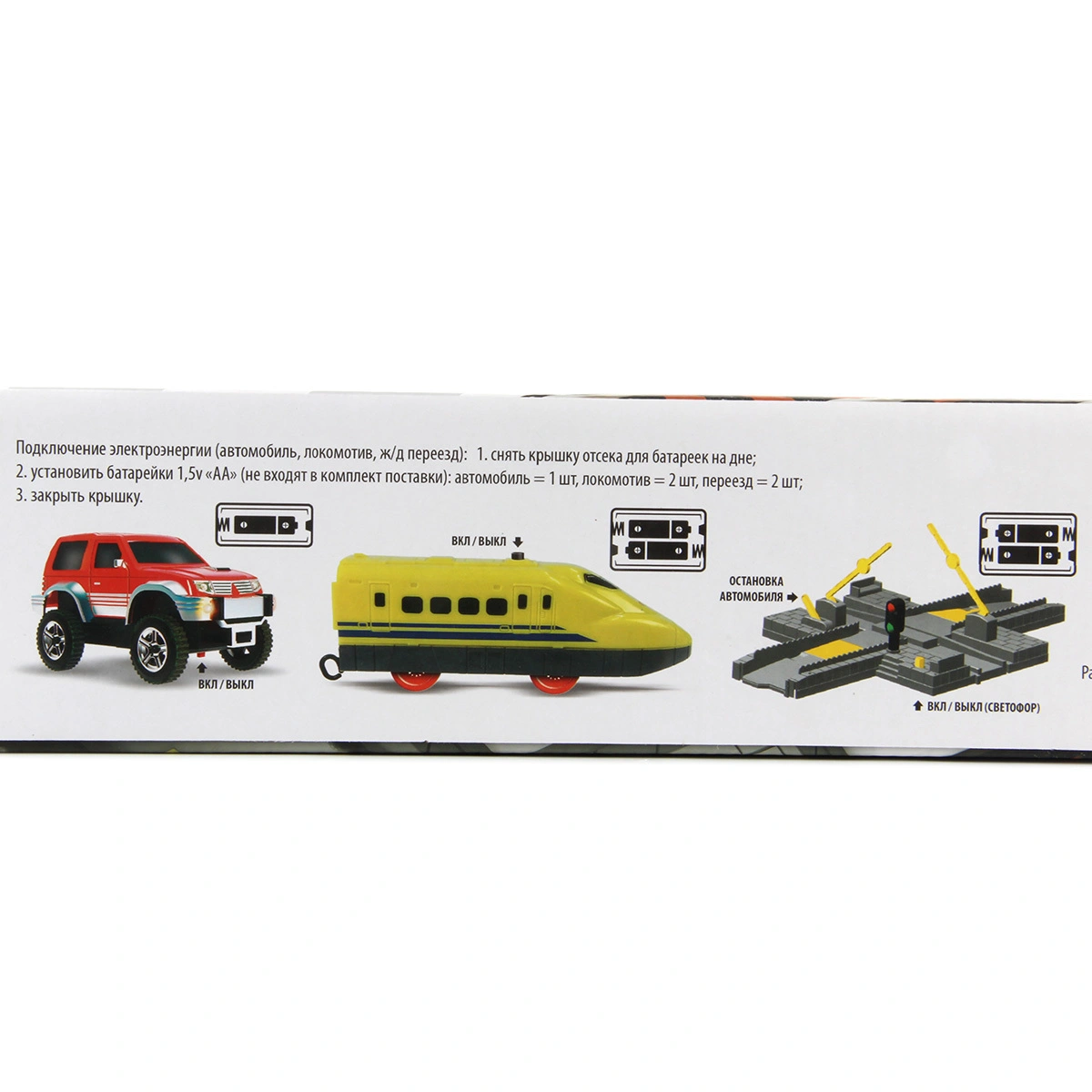 Питание скоростного поезда (свет, звук): 2 батарейки типа АА на 1,5 V; питание машинки (свет 3-х ламп): 1 батарейка типа АА на 1,5 V; питание ж/д переезда (свет, звук): 2 батарейки типа АА на 1,5 V. Элементы питания не входят в комплект.