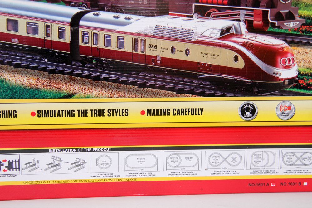 Набор детской железной дороги включает в себя поезд и вагон, рельсы. Рельсы можно выложить разной конфигурацией. Данный набор дает возможность выстраивать 1 круговую трассу.