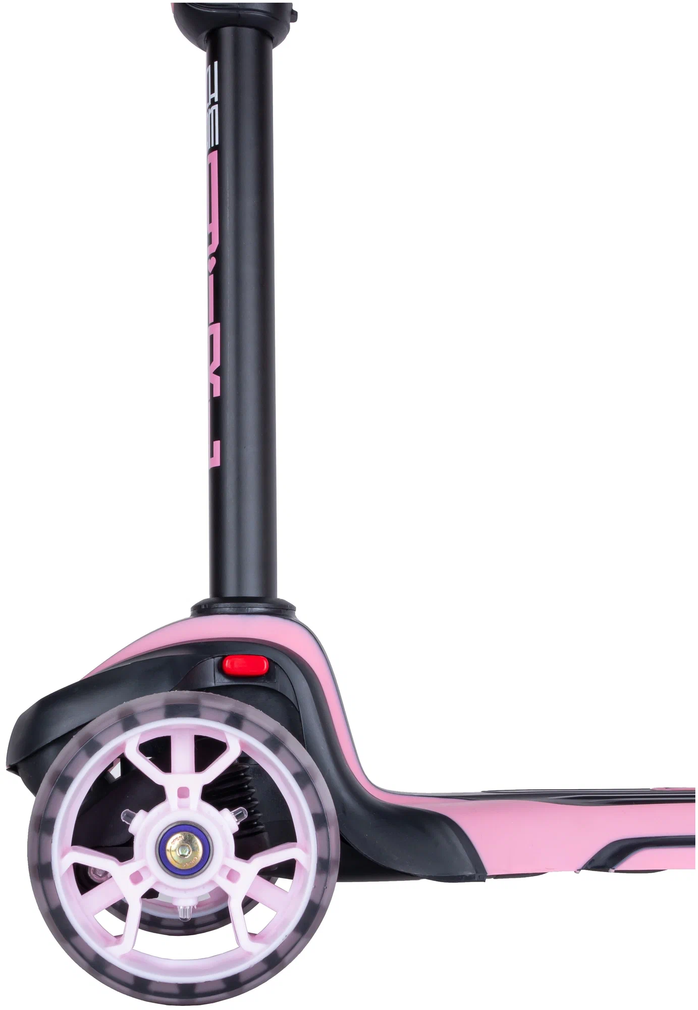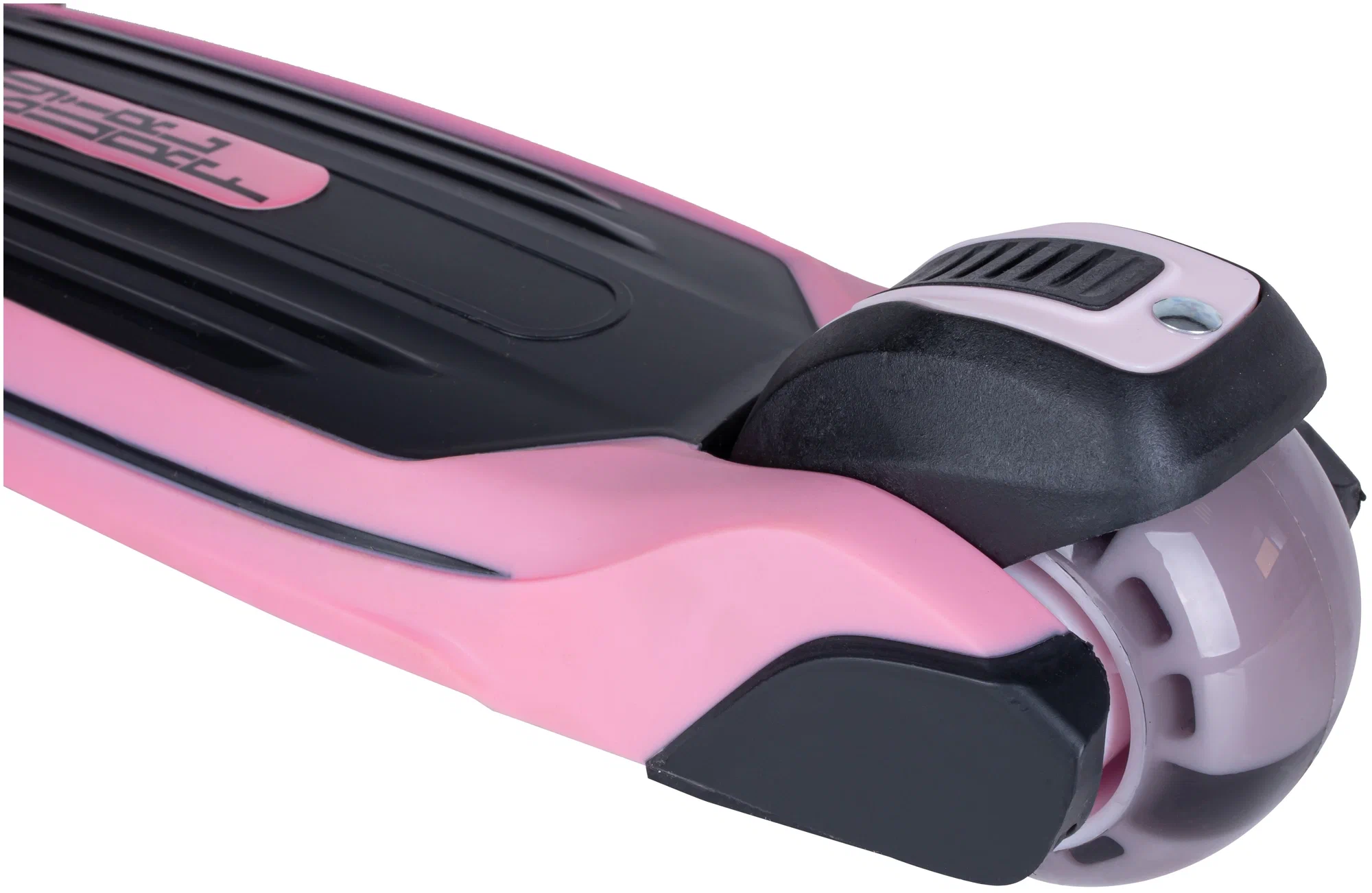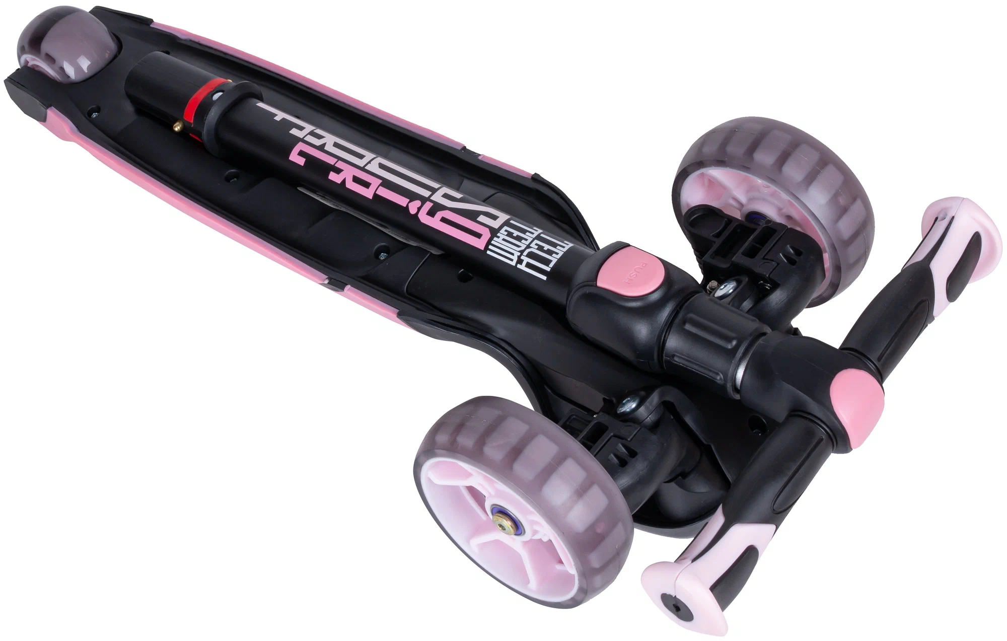 Широкие колеса из прочной пластмассы с полиуретановым покрытием обеспечивают отличную амортизацию и накат. Передние колеса имеют размер 120х40 мм, задние — 80х50 мм. Заднее колесо оснащено крылом-тормозом для безопасной остановки. Все колеса имеют светодиодную подсветку, которая активируется при движении, добавляя яркие эмоции в каждую поездку.